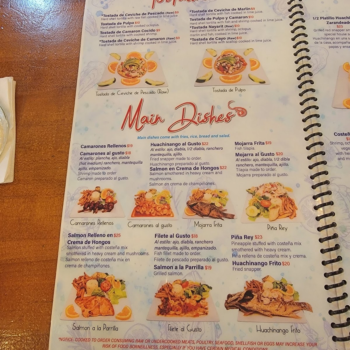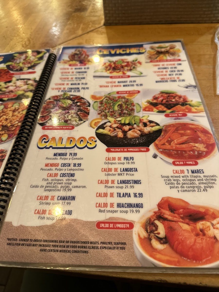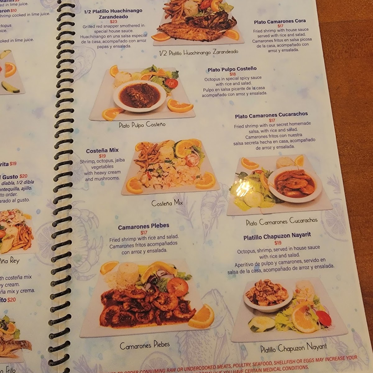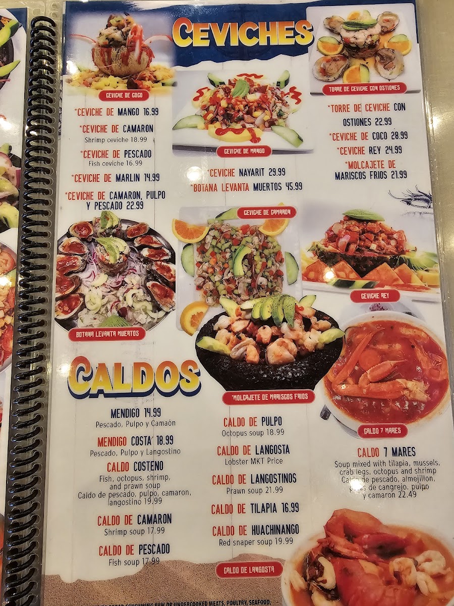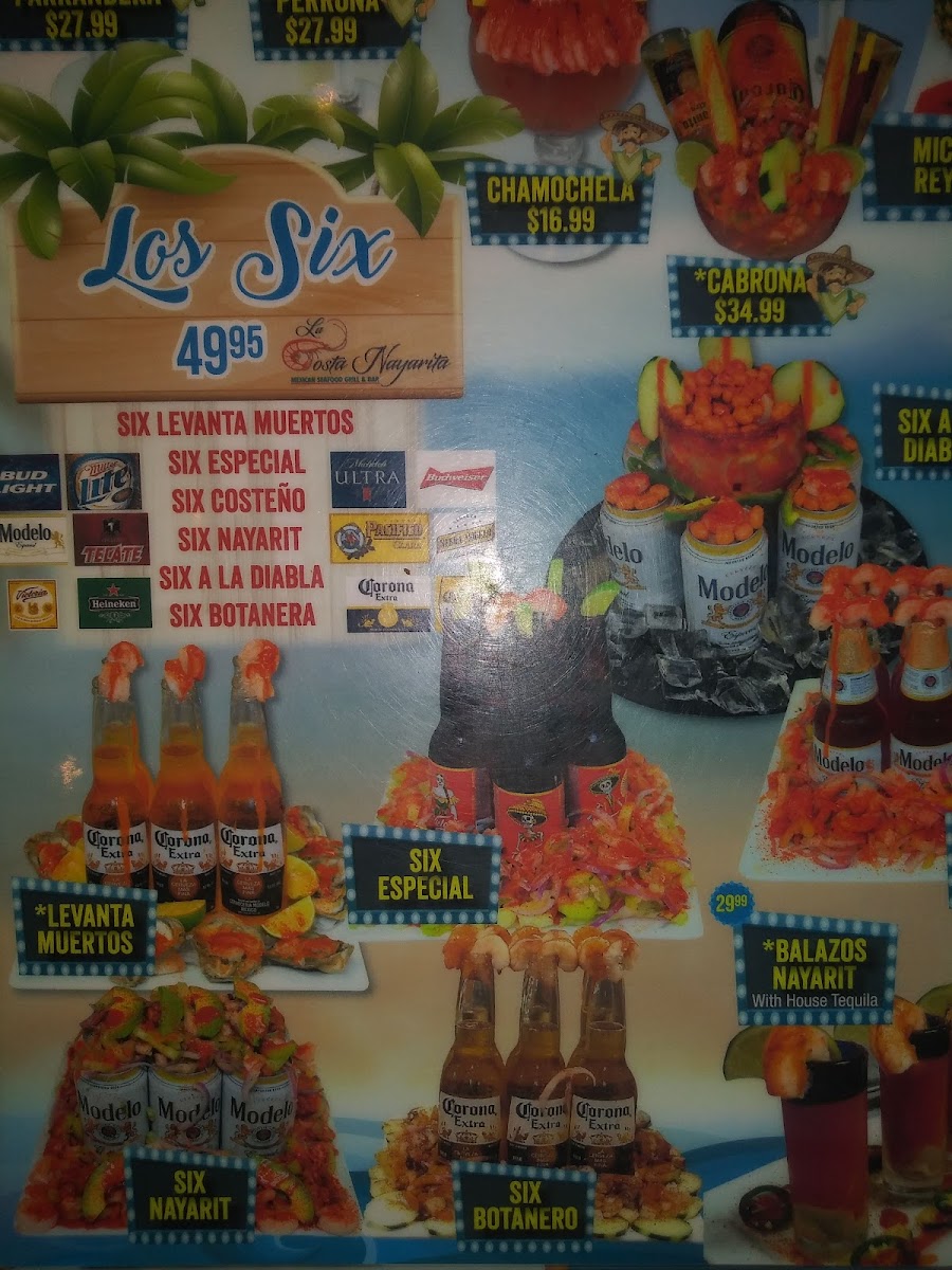 The menu at La Costa Mexican Seafood offers a variety of Mexican seafood dishes and beverages, presented in several distinct sections. Visitors can expect a selection of specialty seafood platters and combination meals grouped under items like "Los Six," which feature options such as Levanta Muertos, Especial, Costeno, Nayarit, A La Diabla, and Botanera, each priced consistently.