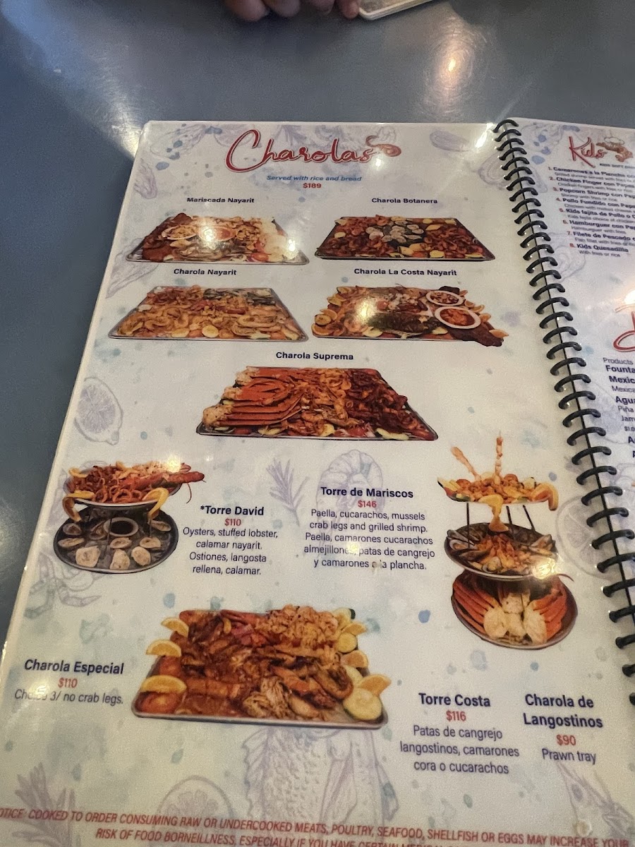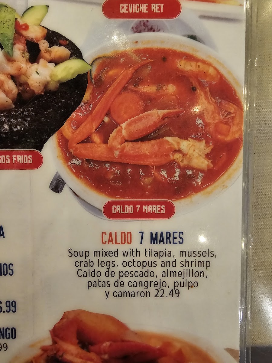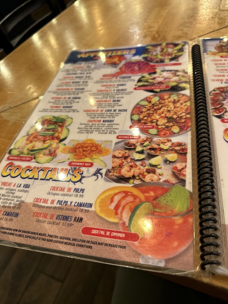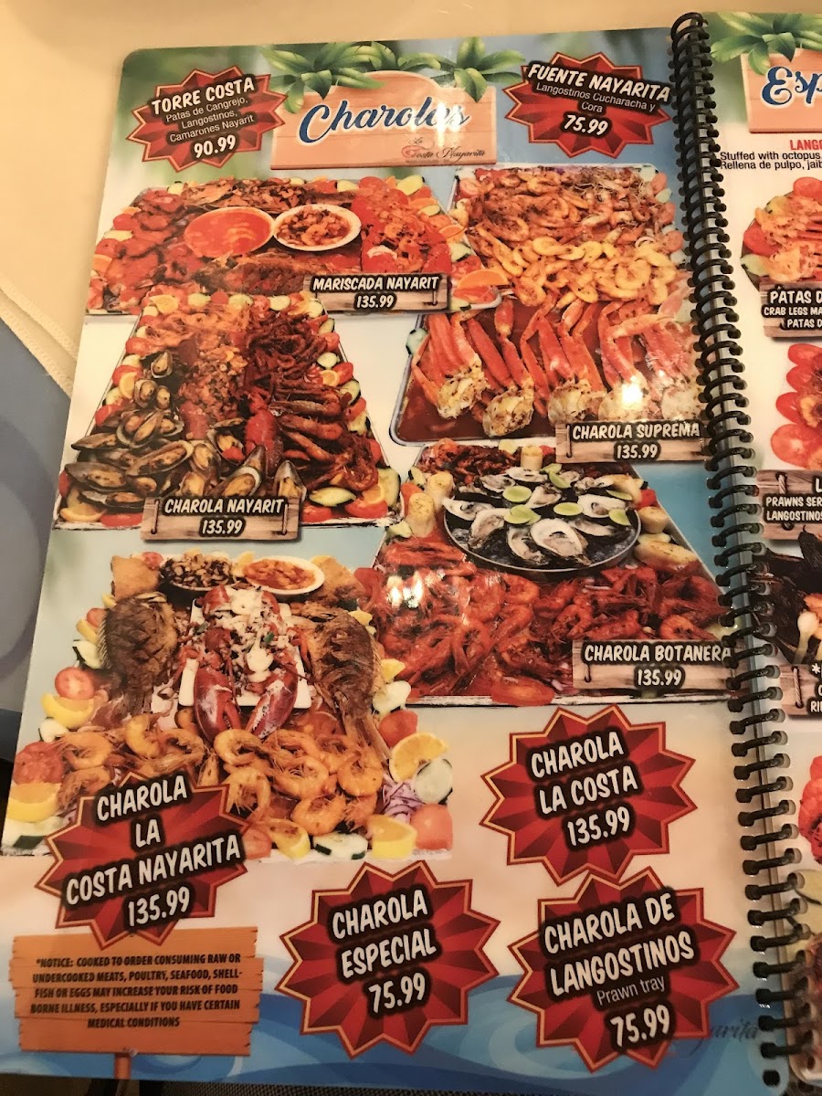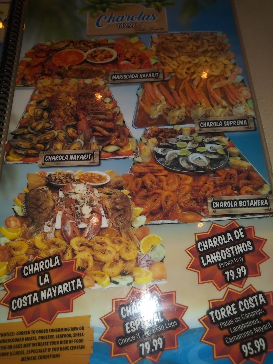 The menu at La Costa Mexican Seafood offers a variety of Mexican seafood dishes and beverages, presented in several distinct sections. Visitors can expect a selection of specialty seafood platters and combination meals grouped under items like "Los Six," which feature options such as Levanta Muertos, Especial, Costeno, Nayarit, A La Diabla, and Botanera, each priced consistently.